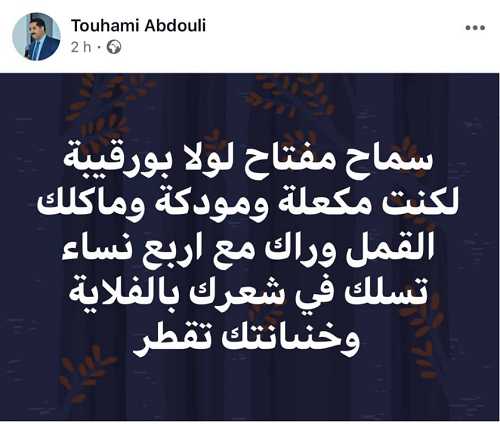 المنبر التونسي (سماح مفتاح، التوهامي العبدولي)- صرّح كاتب الدولة السابق التوهامي العبدولي امس الثلاثاء 05 نوفمبر 2019، بأنه لم يكن يريد بتدوينته الإساءة للصحفية سماح مفتاح بقدر تذكيرها بفضل بورقيبة على المرأة في تونس، وذلك في تدخل له على راديو جوهرة أف أم.