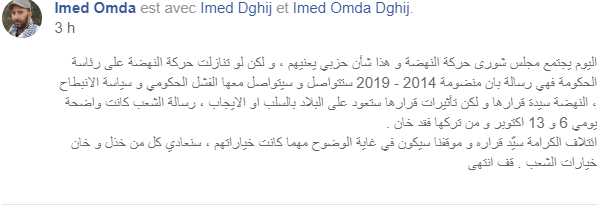 المنبر التونسي(عماد دغيج) – نشر عماد دغيج القيادي بائتلاف الكرامة اليوم السبت 09 نوفمبر 2019، تدوينة على صفحته الرسمية بالفايسبوك قال فيها أنه لو تنازلت حركة النهضة على رئاسة الحكومة فهي رسالة بأن منظومة 2014 – 2019 ستتواصل و سيتواصل معها الفشل الحكومي وسياسة الانبطاح.