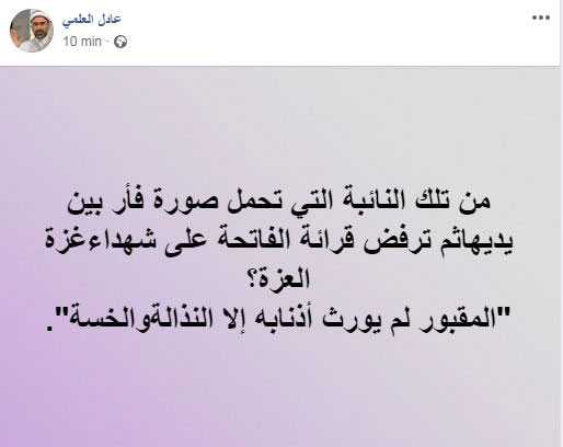 وندّد في تدوينته برفض رئيسة الحزب الدستوري الحرّ عبير موسي قراءة الفاتحة على شهداء غزة، قائلا ”من تلك النائبة التي تحمل صورة فأر بين يديها ثم ترفض قرائة الفاتحة على شهداء غزة العزة”، وأضاف أنّ بورقيبة لم يورّث لموسي ومحبيه سوى ”النذالة والخسّة’
