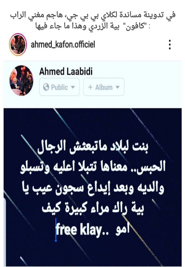 المنبر التونسي(كافون) – عبر مغني الراب “كافون” عن مساندته لكلاي بي بي جي الذي تم إيقافه في قضية رفعتها ضده بية الزردي.