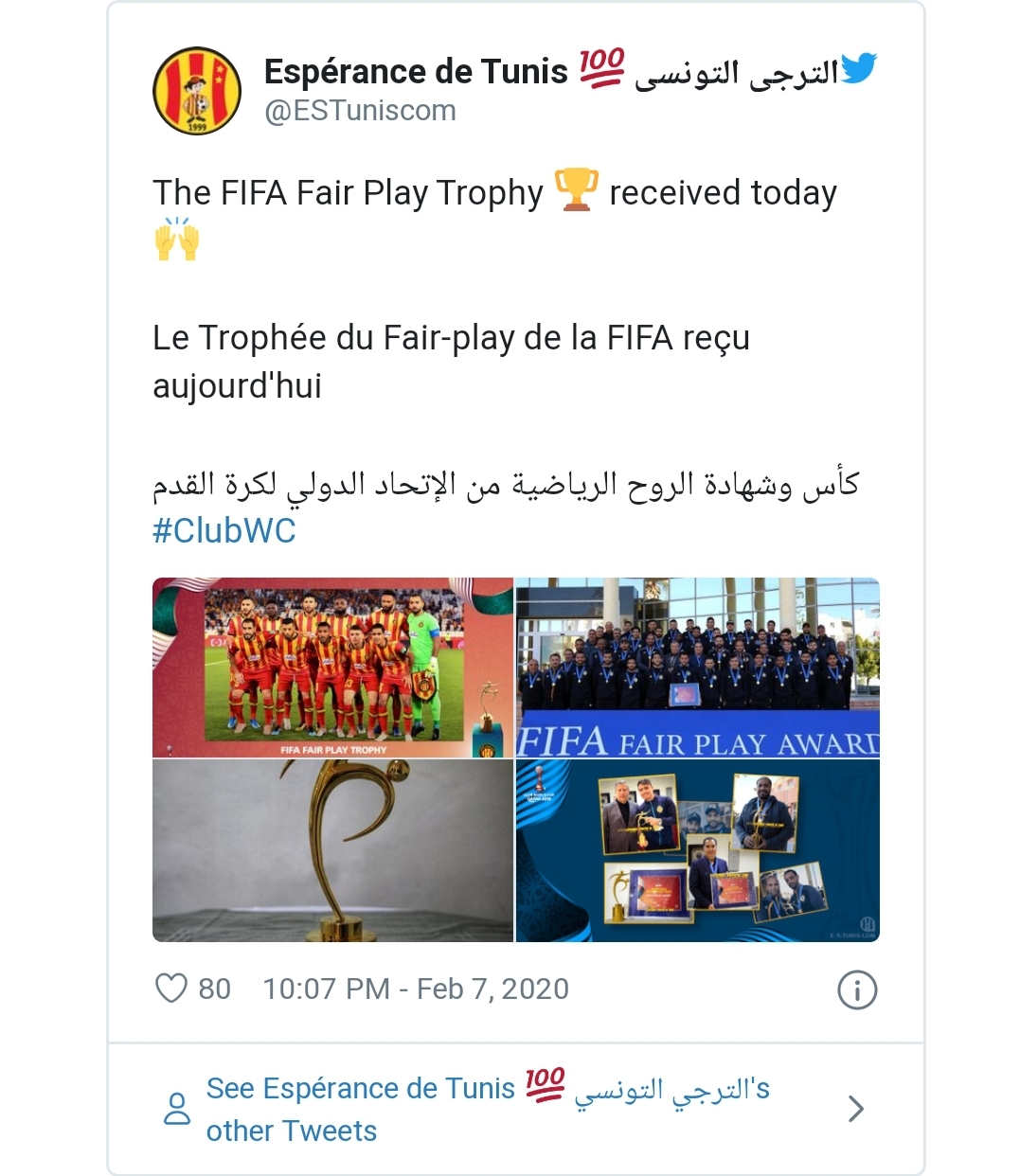 صورة: “الفيفا” يمنح الترجي التونسي جائزة “اللعب النظيف”