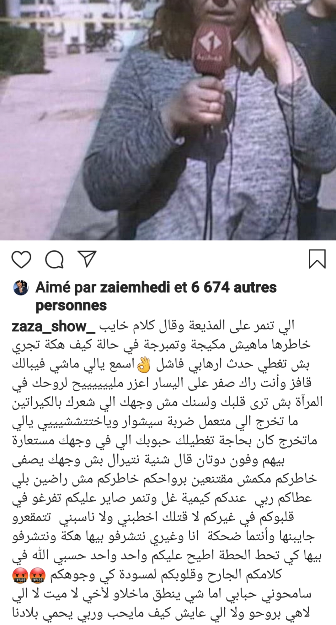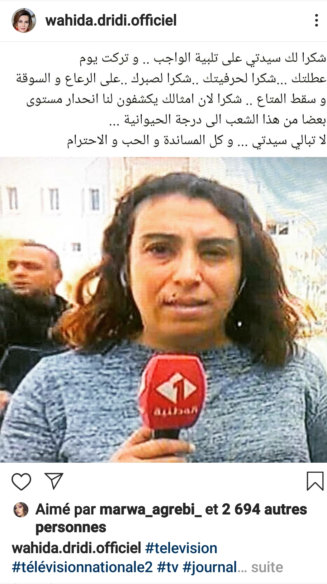 وتتالت التعليقات المساندة للزميلة الصحفية حيث أشاد الجميع بكفاءتها وأخلاقها، فهي من افضل اعلاميي التلفزة التونسية حيث كرست مجهودها لإيصال المعلومة الى المواطن دون التركيز على المظاهر و الشكل خاصة في مثل هذه الاحداث.