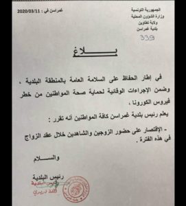 المنبر التونسي(بلدية غمراسن) – قررت بلدية غمراسن في ولاية تطاوين الاقتصار على حضور الزوجين و الشاهدين خلال عقد الزواج و ذلك في اطار الاجراءات الوقائية لحماية صحة المواطنين من خطر فيروس كورونا.