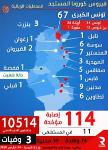 المنبر التونسي (كورونا) – أعلنت وزارة الصحة اليوم الثلاثاء 24 مارس 2020، أنه بتاريخ 23 مارس 2020، تم تسجيل 25 حالة إصابة جديدة من مجموع 124 تحليلا مخبريا ليصبح العدد الجملي للمصابين بهذا الفيروس 114 حالة مؤكدة (74 حالة مستوردة و39 حالة محلية) من بين 1211 تحليل جملي.