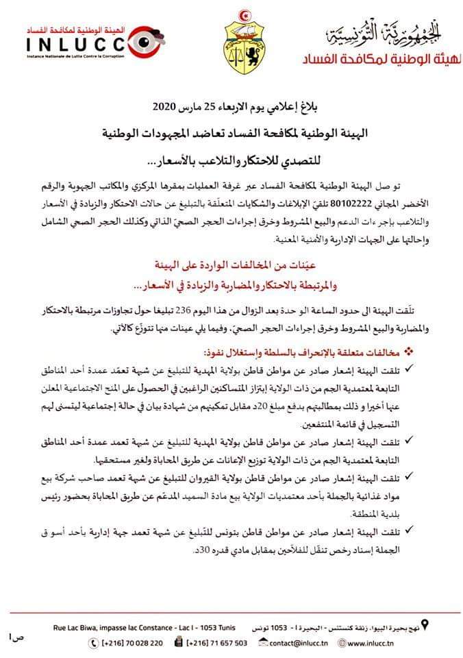 بلاغ حول التبليغات الواردة على هيئة مكافحة الفساد بخصوص مظاهر الإحتكار والتلاعب بالأسعار