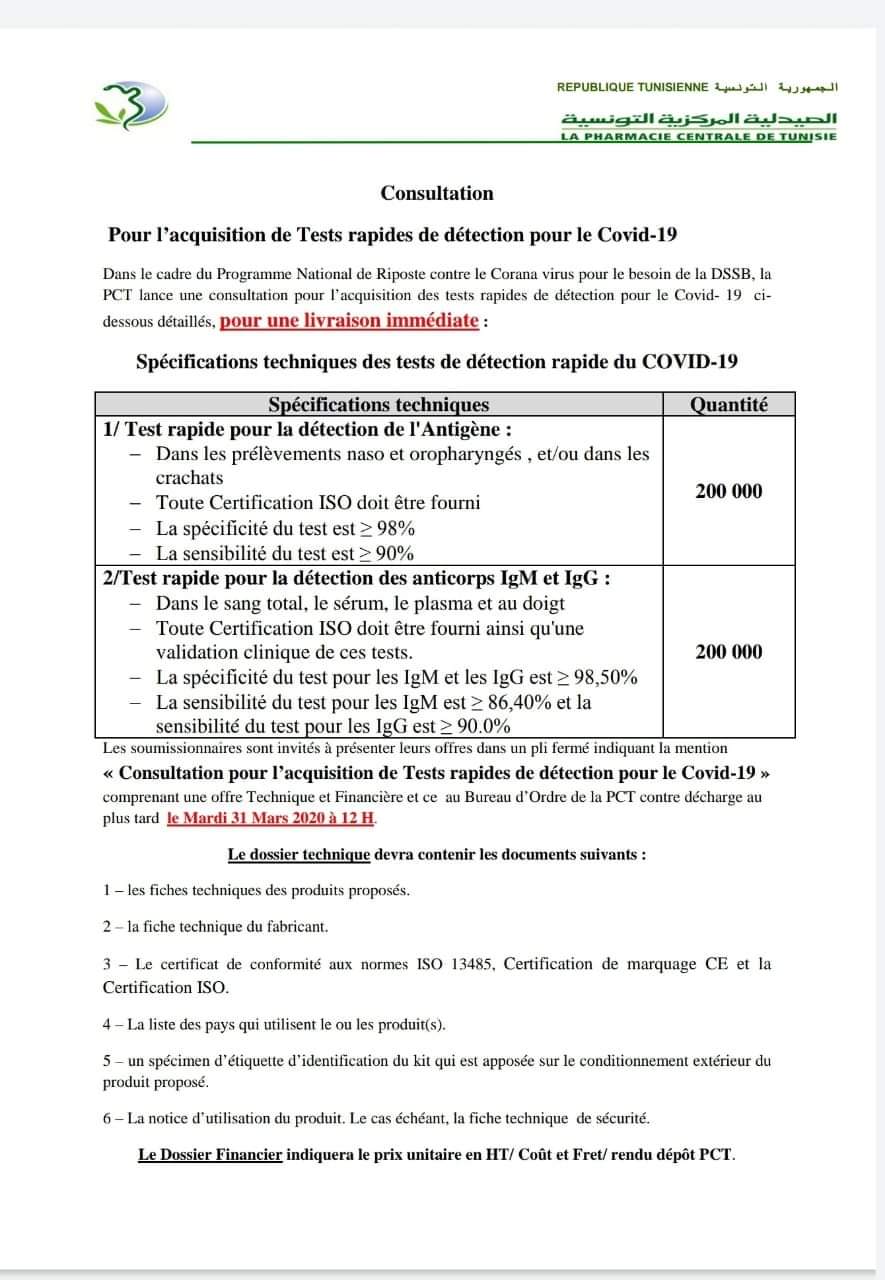 المنبر التونسي(الصيدلية المركزية) – أصدرت الصيدلية المركزية اليوم طلب عروض لإقتناء 400 ألف جهاز Testeurs لإكتشاف فيروس كورونا، رغم تأكيد مديرة مرصد الأمراض الجديدة والمتجددة نصاف بن علية سابقا على أن وزارة الصحّة لا تثق في مثل هذه الأجهزة.