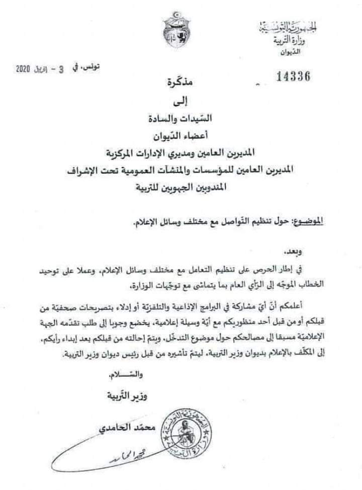 المنبر التونسي(محمد الحامدي) – وجّه وزير التربية محمد الحامدي، الجمعة 3 أفريل 2020، مذكرة إلى كافة أعضاء ديوانه ومسؤولي الوزارة والمديرين الجهويين والمديرين العامين للمنشآت والمؤسسات تحت الإشراف بخصوص التصريحات الإعلامية لمختلف وسائل الإعلام.