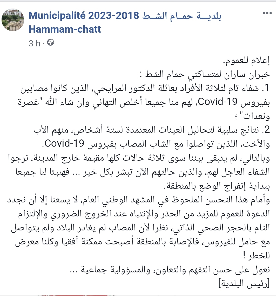 المنبر التونسي(لطفي المرايحي) – أعلنت بلدية حمام الشط التابعة لولاية بن عروس، مساء الأحد 5 أفريل، عن شفاء ثلاثة أفراد من عائلة رئيس حزب الاتحاد الاشعبي الجمهوري لطفي المرايحي من فيروس كورونا.