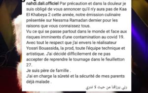 المنبر التونسي(محمد علي النهدي) – اعتذر محمد علي النهدي عن العودة لتصوير حصة الطبخ “قاع الخابية 2 ” و”مسلسل 27″ بسبب الظروف العائلية وخوفا من عدوى الكورونا.