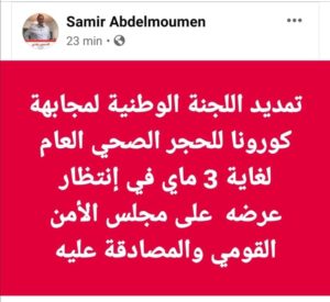عاجل : ﺗﻤﺪﻳﺪ ﺍﻟﺤﺠﺮ ﺍﻟﺼﺤﻲ ﺍﻟﻌﺎﻡ ﻟﻐﺎﻳﺔ ﻫﺬﺍ ﺍﻟﺘﺎﺭﻳﺦ ﺇﻧﺘﻈﺎﺭ ﻋﺮﺿﻪ ﻋﻠﻰ ﻣﺠﻠﺲ ﺍﻷﻣﻦ ﺍﻟﻘﻮﻣﻲ ﻭﺍﻟﻤﺼﺎﺩﻗﺔ ﻋﻠﻴﻪ “صورة “