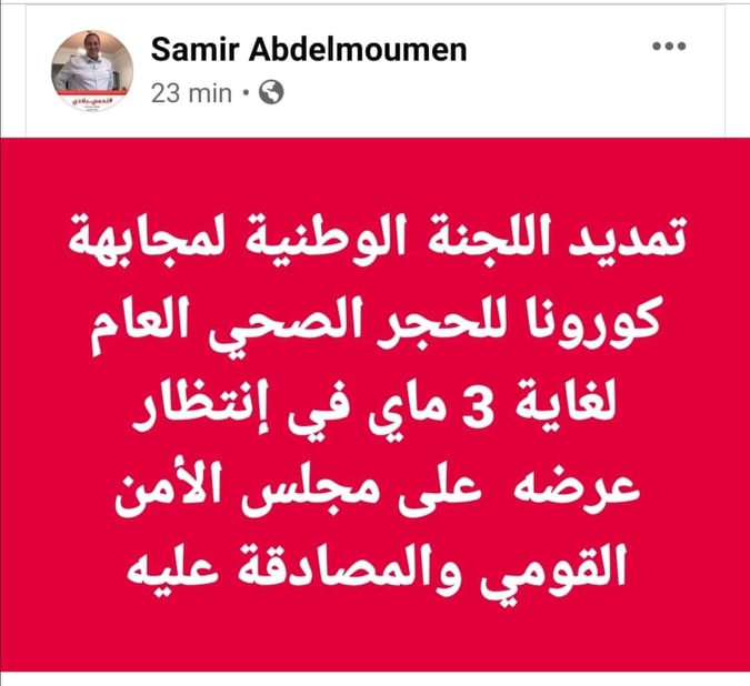 المنبر التونسي (الحجر الصحي)-ﺃﻭﺻﺖ ﺍﻟﻠﺠﻨﺔ ﺍﻟﻮﻃﻨﻴﺔ ﻟﻤﺠﺎﺑﻬﺔ ﻭﺑﺎﺀ ﺍﻟﻜﻮﺭﻭﻧﺎ ﺑﺎﻟﺘﻤﺪﻳﺪ ﻓﻲ ﺍﻟﺤﺠﺮ ﺍﻟﺼﺤﻲ ﺍﻟﻌﺎﻡ ﺇﻟﻰ ﻏﺎﻳﺔ ﻳﻮﻡ 3 ﻣﺎﻱ، ﻭﻓﻖ ﻣﺎ ﺃﻛّﺪﻩ ﻋﻀﻮ ﺍﻟﻠﺠﻨﺔ ﺳﻤﻴﺮ ﻋﺒﺪ ﺍﻟﻤﺆﻣﻦ ﻋﻠﻰ ﺻﻔﺤﺘﻪ ﺑﺎﻟﻔﺎﻳﺴﺒﻮﻙ