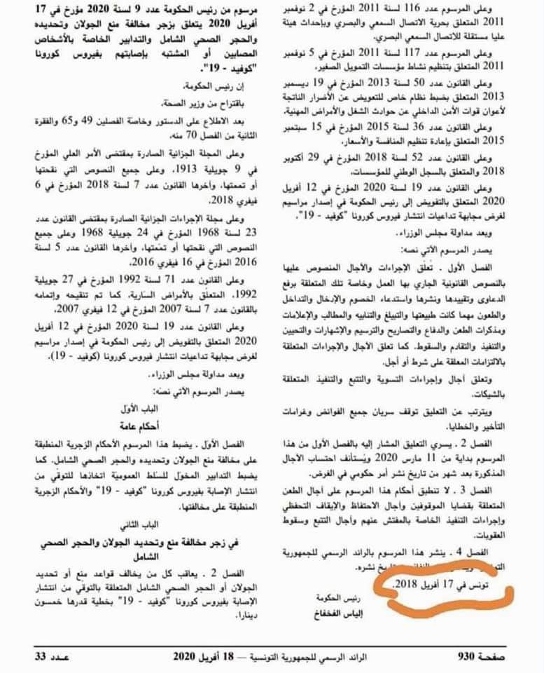 وتعلّق بتاريخ تنفيذه حيث كُتِب في الفصل الرابع “ينشر هذا المرسوم بالرائد الرسمي للجمهورية التونسية ويدخل حيز النفاذ من تاريخ نشره. تونس 17 أفريل 2018”.