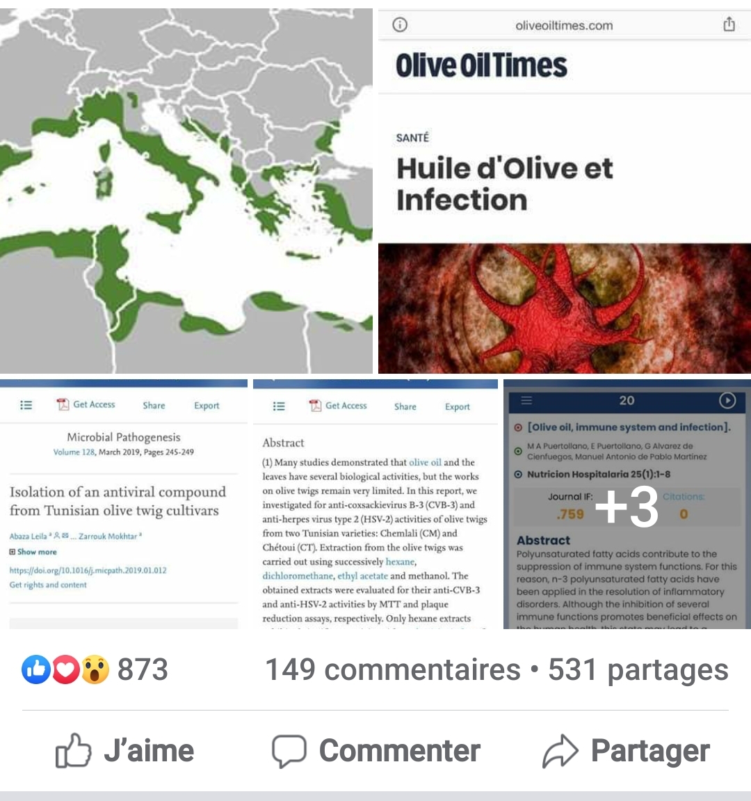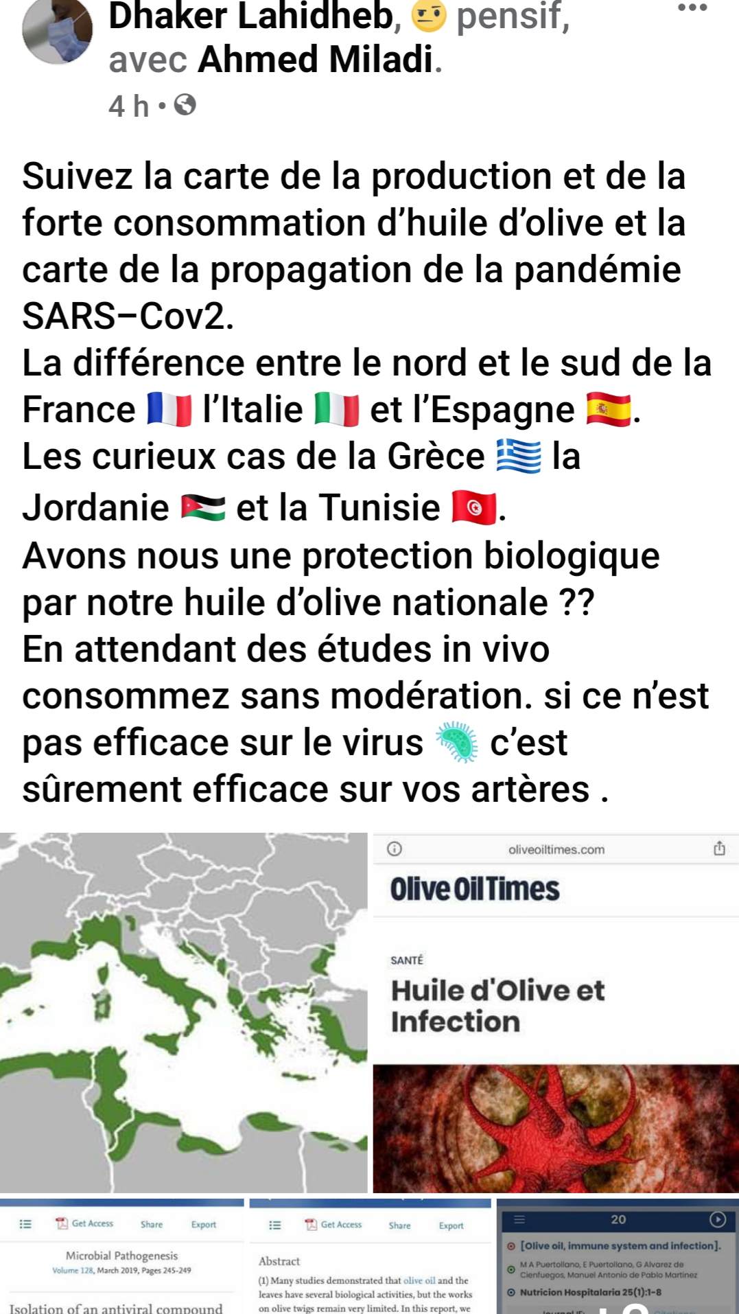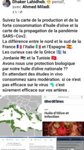 واشار في تدوينة على صفحته الرسمية على شبكة التواصل الاجتماعي، الى انه في انتظار دراسات جدية حول فاعلية زيت الزيتون في زيادة المناعة ضد الفيروس فإن المؤكد أن عادة تناول زيت الزيتون تساهم في تقوية أداء شرايين القلب التي تتضرر من الفيروس و تسببت في عديد حالات الموت الفجئي.