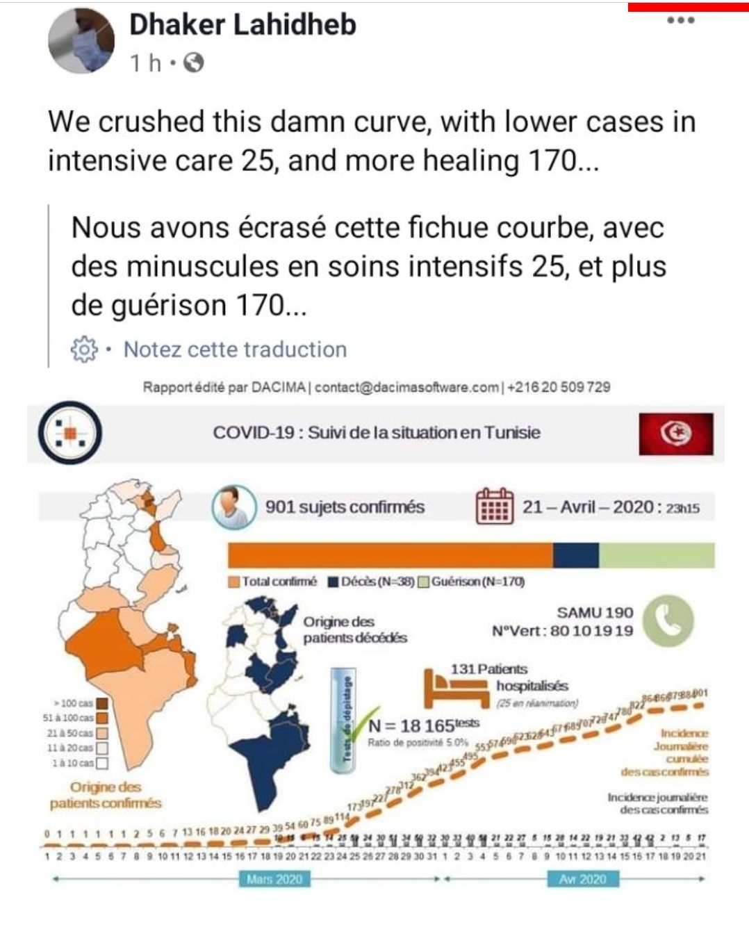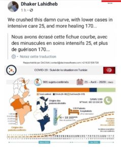 المنبر التونسي(ذاكر لهيذب) – نشر الدكتور ذاكر لهيذب رسم بياني على حسابه الشخصي بالفايسبوك اليوم الأربعاء تحدث فيه عن استقرار الحالة الوبائية في تونس بتسجيل 170حالة شفاء تام و 25 حالة حرجة فقط.