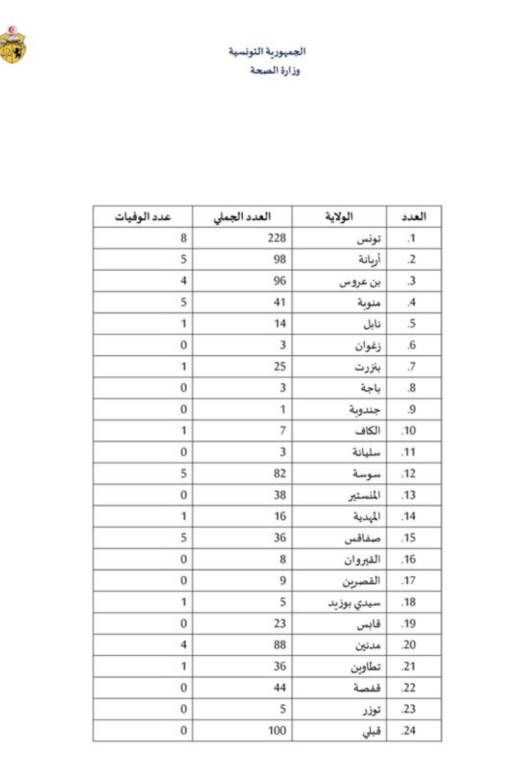 وقد تم تسجيل 19 تحليلا إيجابيا، 15 منها حالات إصابة سابقة لا تزال حاملة للفيروس و4 حالات إصابة جديدة ليصبح العدد الجملي للمصابين بهذا الفيروس، وذلك بعد التثبت من المعطيات وتحيينها، 1013 حالة مؤكدة من بينها: 328 حالة شفاء و42 حالة وفاة و643 حالة إصابة لا زالت حاملة للفيروس وهي بصدد المتابعة.