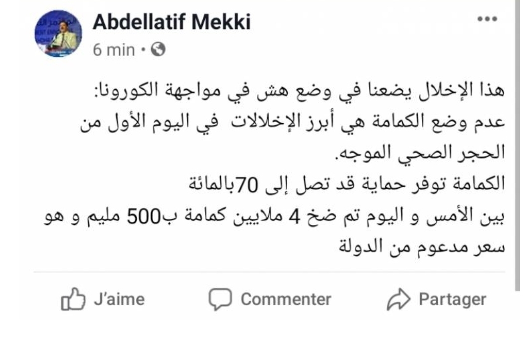 واعتبر ان هذا الإخلال يضعنا في وضع هش في مقاومة الكورونا،مضيفا بأن الكمامة توفر حماية بنسبة 70% مؤكدا على ضخ 4 مليون كمامة بسعر رمزي.