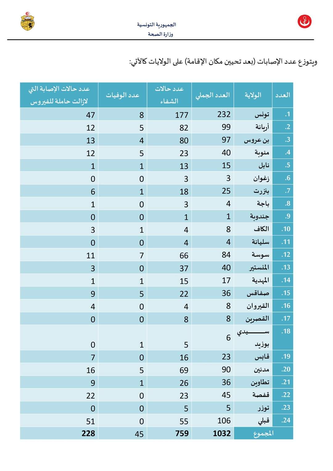 المنبر التونسي (كورونا) – أظهرت معطيات نشرتها وزارة الصحة منذ قليل حول الوضع الوبائي لفيروس كورونا في تونس، خلو 6 ولايات في الجمهورية من فيروس كورونا.