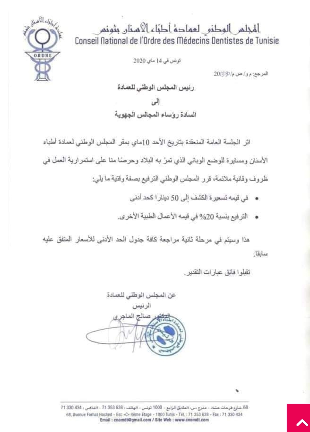 المنبر التونسي(اطباء الاسنان) – قرر المجلس الوطني لعمادة أطباء الأسنان بتونس الترفيع بصفة وقتية في قيمة تسعيرة الكشف والأعمال الطبية الأخرى.