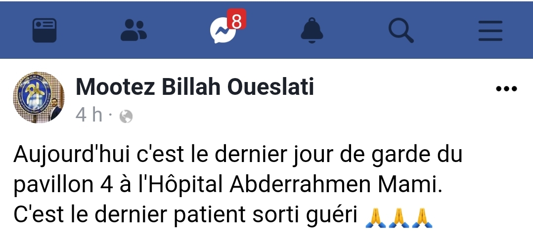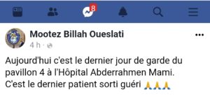 ووفق معتز بالله الوسلاتي العضو بالجنة الوزارية لجمع التبرعات وإدارتها والتصرف، فإنّ آخر مريض بالجناح كانت نتائجه سلبية مما يعني آخر متعافي من فيروس كورونا سيُغادر المستشفى قائلاً “إنها ليلة الإنتصار، الحمد لله يا رب”.