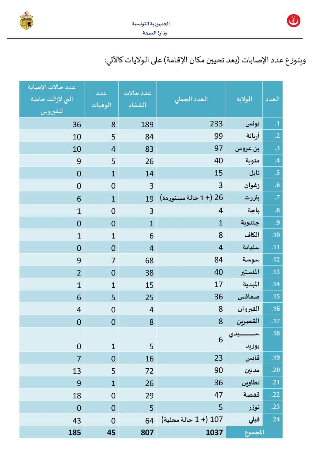 وبلغ عدد المتماثلين للشفاء 807 حالة وارتفع عدد الولايات الخالية من الفيروس إلى 7 و هي نابل، زغوان، جندوبة، سليانة، القصرين، سيدي بوزيد، وتوزر.