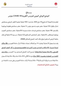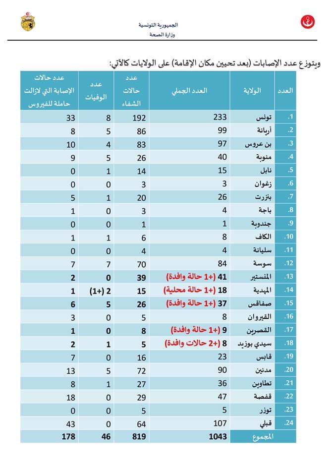 المنبر التونسي (كورونا) – أعلنت وزارة الصحة في بلاغها الصادر اليوم الإثنين 19 ماي 2020 عن تسجيل 06 إصابات جديدة بكورونا ليرتفع العدد إلى 1043 حالة.