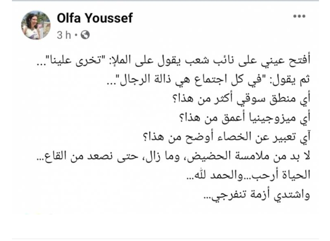 المنبر التونسي (الفة يوسف) – انتقدت الجامعية ألفة يوسف ،ممارسات سيف مخلوف رئيس كتلة إئتلاف الكرامة في البرلمان بعد المناوشات مع رئيسة كتلة الدستوري الحر عبير موسي في بهو المجلس .