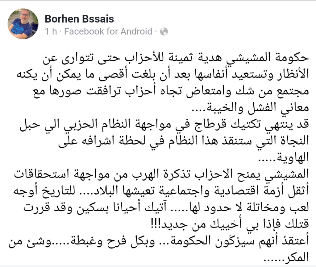 المنبر التونسي(برهان بسيس) – علق الإعلامي، برهان بسيس، على تصريحات رئيس الحكومة المكلف، هشام المشيشي، بخصوص اعتزامه تكوين حكومة كفاءات مستقلة تماما.