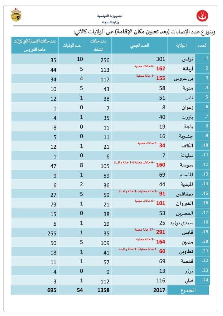 المنبر التونسي(كورونا) – بلغ عدد حالات الإصابة بفيروس كورونا في تونس 2107 إصابة، من بينها 1358 حالة شفاء و695 حالة لا تزال حاملة للفيروس و54 وفاة.
