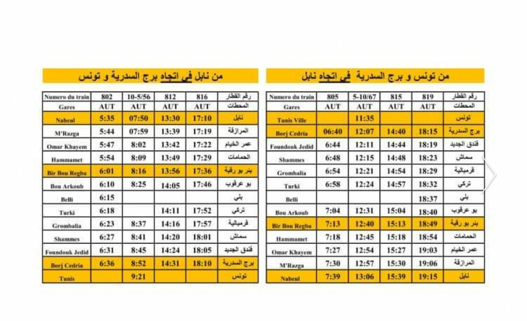 المنبر التونسي(السكك الحديدية) – أعلنت الشركة الوطنية للسكك الحديدية التونسية اليوم،الثلاثاء 13 أكتوبر 2020، عن أوقات قطارات الخطوط البعيدة خلال حظر التجوّل، والتي ستكون على النحو التالي: