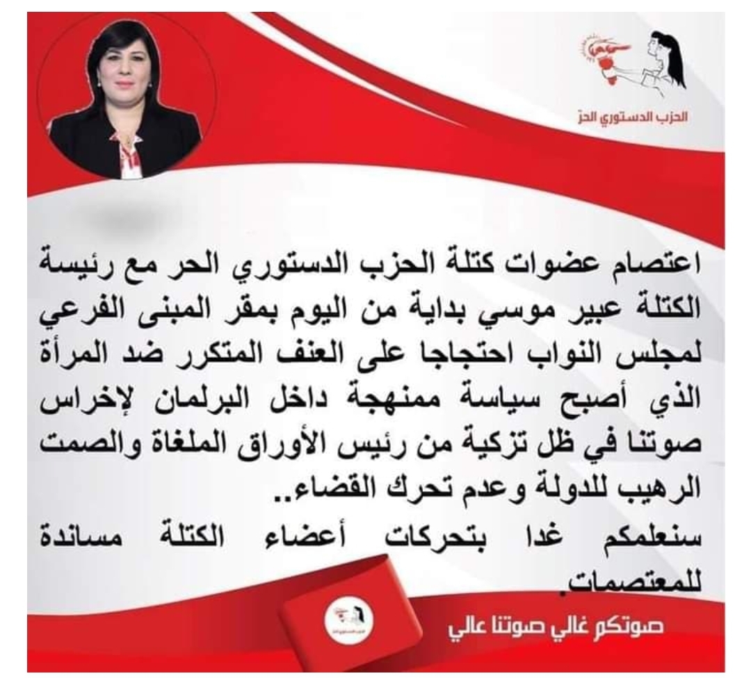 وقالت كتلة الدستور الحر، إن العنف المتكرر ضد المرأة أصبح سياسة ممنهجة داخل البرلمان في ظل تزكية من رئيس الأوراق الملغاة والصمت الرهيب للدولة وعدم تحرك القضاء.