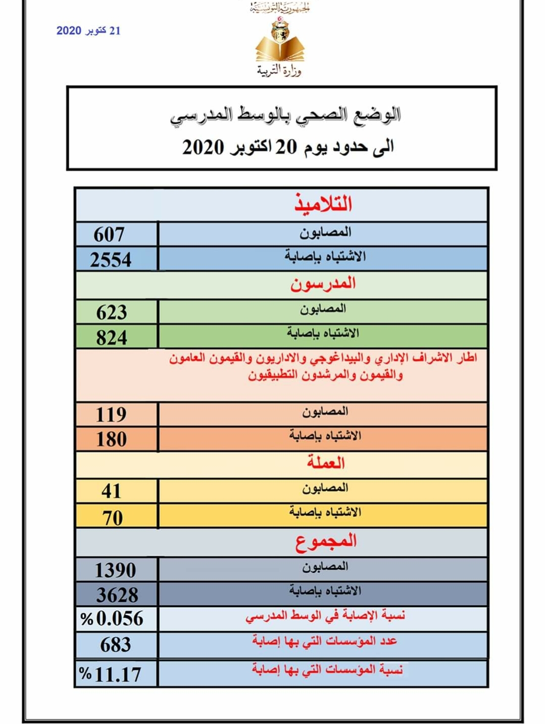 وبهذا يبلغ عدد الإصابات في الوسط المدرسي منذ مطلع السنة الدراسية وإلى غاية يوم 20 أكتوبر الجاري 1390 إصابة.