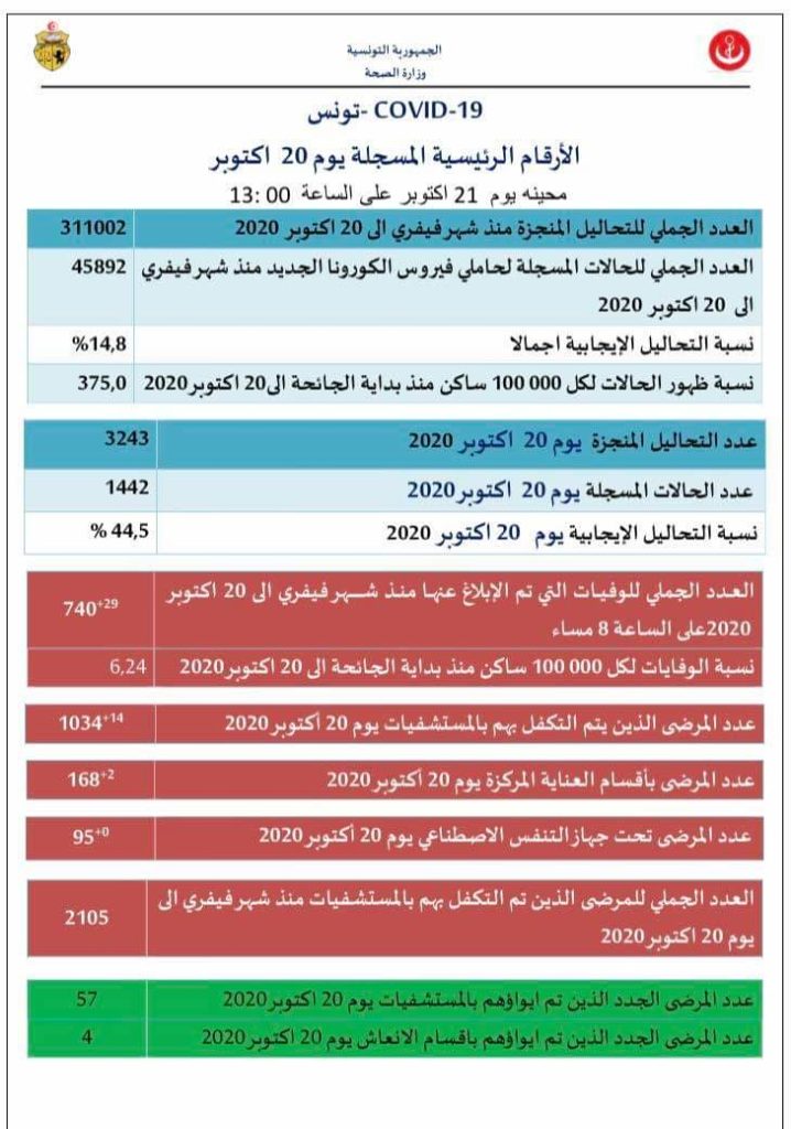المنبر التونسي (كورونا تونس) – أعلنت وزارة الصحة، تسجيل 1442 إصابة جديدة بفيروس كورونا بتاريخ 20 أكتوبر 2020، من جملة 3243 تحليل، ليرتفع العدد الجملي للإصابات إلى 45892 إصابة جملية .