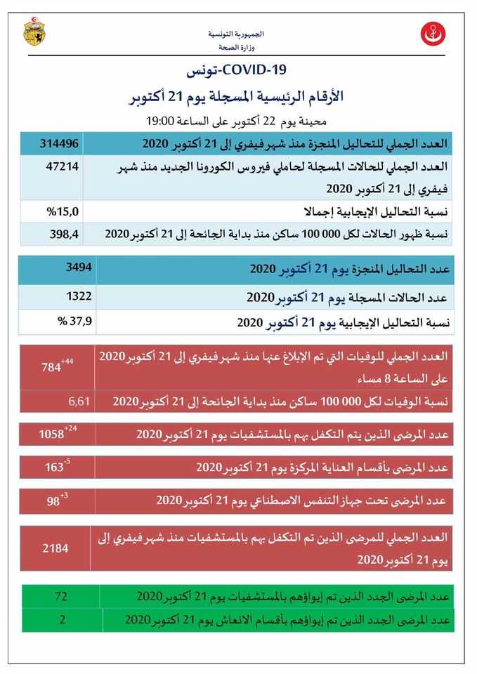 كما أعلنت  وزارة الصحة أنّ عدد حالات الوفاة المسجلة يوم 22 أكتوبر الجاري بلغت 44 حالة وفاة ليبلغ العدد الجملي للوفيات منذ شهر فيفري وإلى حدود 20 أكتوبر الجاري، 784 حالة وفاة. ا بلغ عدد المرضى الذين يتمّ التكفّل بهم في المستشفيات بتاريخ 22 أكتوبر، 1058 مريض، وبلغ عدد المرضى بأقسام العناية المركّزة 163 حالة منهم98 تحت التنفس الاصطناعي.