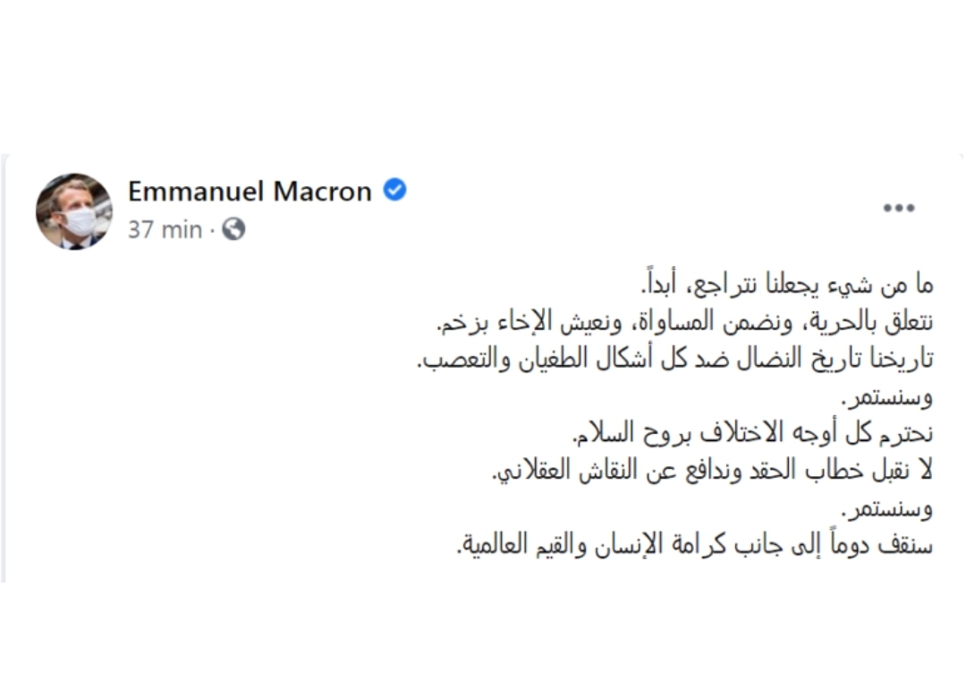 المنبر التونسي(ماكرون) – نشر الرئيس الفرنسي إمانويل ماكرون على حساباته بتويتر و فايسبوك تحديثة باللغة العربية ردّ فيها بشكل ضمني على حملات مقاطعة المنتجات الفرنسية في عدة دول عربية و إسلامية بعد اعادة نشر فرنسا صورا ساخرة من الرسول.