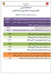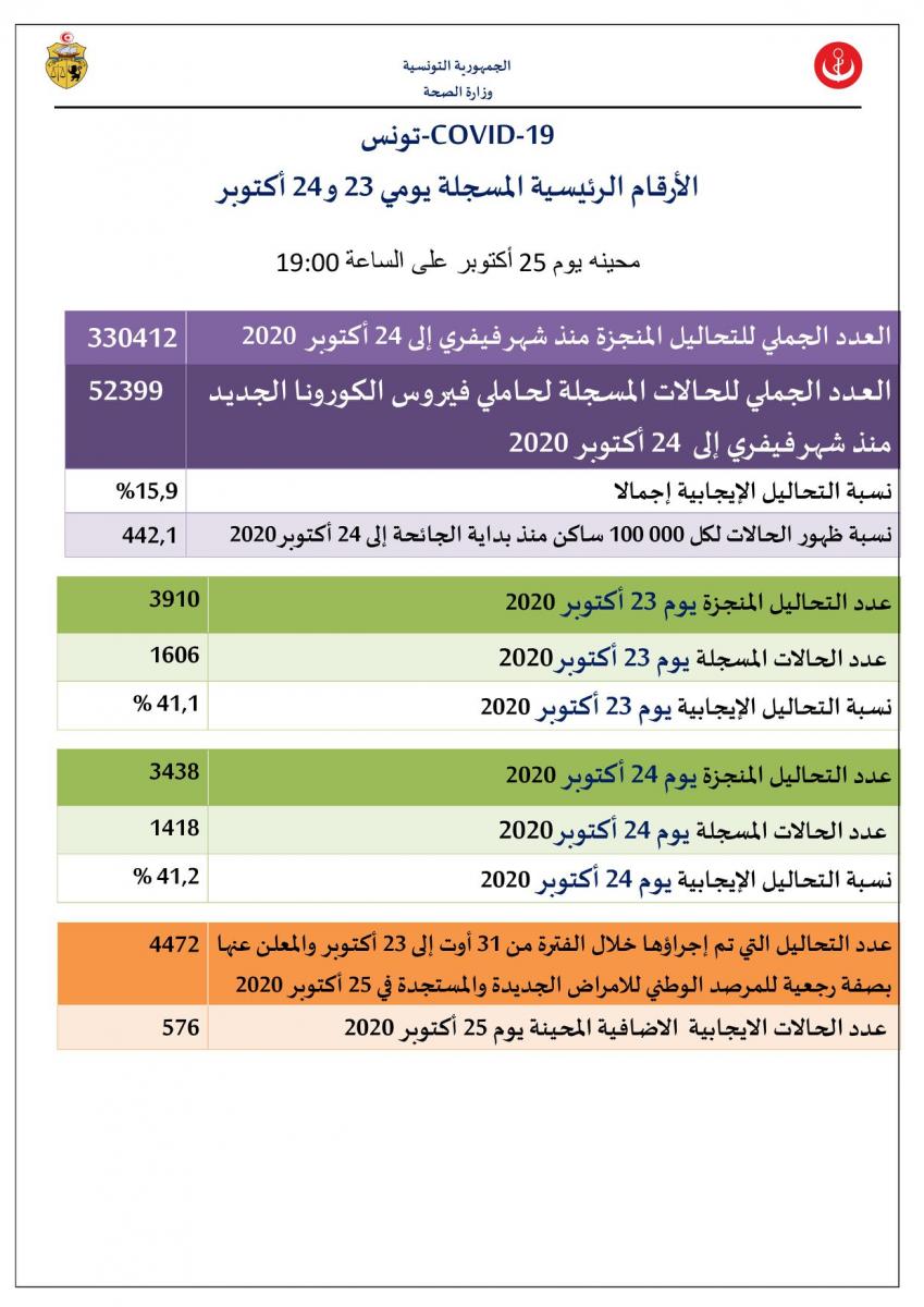 المنبر التونسي(كورونا) – أعلنت وزارة الصحة في بلاغ صباح اليوم الإثنين 26 أكتوبر 2020، عن تسجيل 58 حالة وفاة و 3024 حالة إصابة جديدة بفيروس كورونا خلال يومي 23 و24 أكتوبر الجاري.