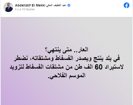 وقال عبد اللطيف المكي، في تدوينة على حسابه بموقع التواصل الاجتماعي فايسبوك ”في بلد ينتج ويصدر الفسفاط ومشتقاته، نضطر لاستيراد 60 الف طن من مشتقات الفسفاط لتزويد الموسم الفلاحي”.