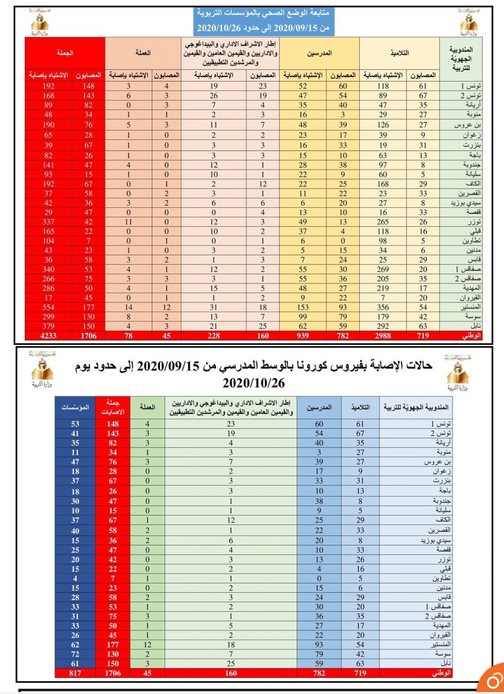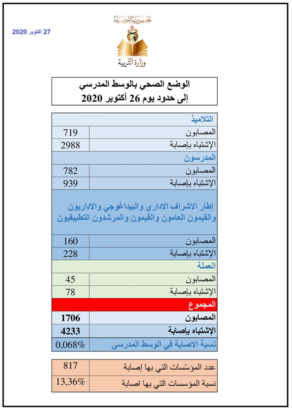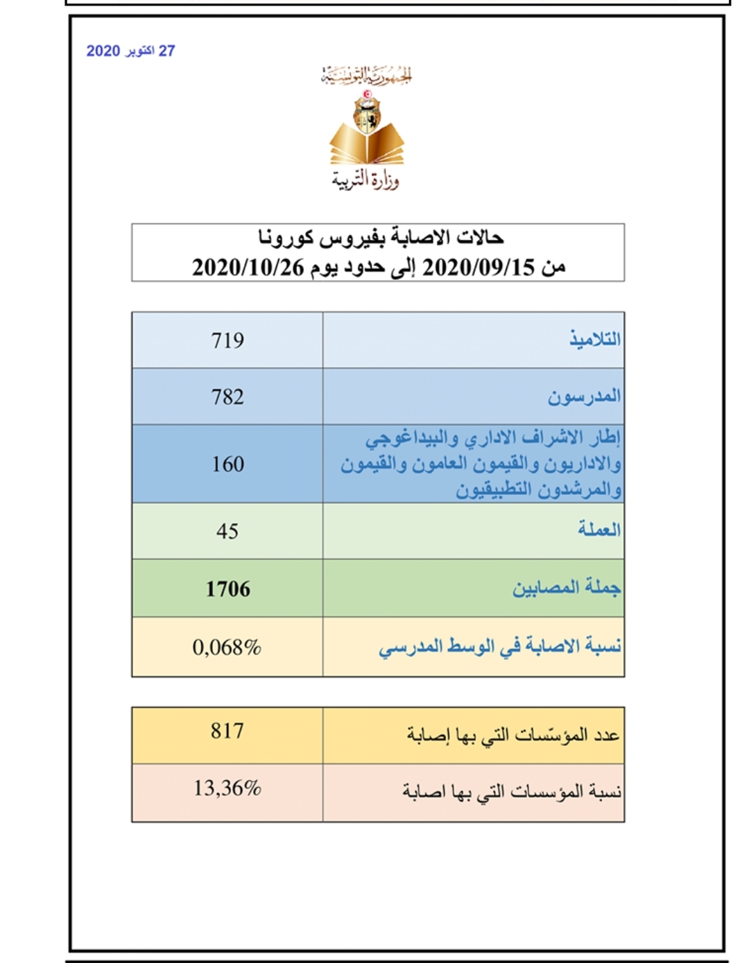 المنبر التونسي(كورونا تونس) – أعلنت وزارة التربية، مساء الثلاثاء، ارتفاع الإصابات بفيروس كورونا المستجد في الوسط المدرسي لتبلغ 1706 من يوم 15 سبتمبر 2020 إلى حدود يوم 26 أكتوبر الجاري.