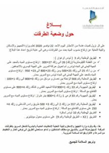 وأكدت الوزارة توفيرها لكل الامكانيات المادية والبشرية للتدخل السريع لتسهيل حركة المرور بالتنسيق مه مختلف المتدخلين داعية مستعملي الطريق الى توخي الحذر والتخفيض من السرعة والالتزام بقواعد السلامة المرورية.