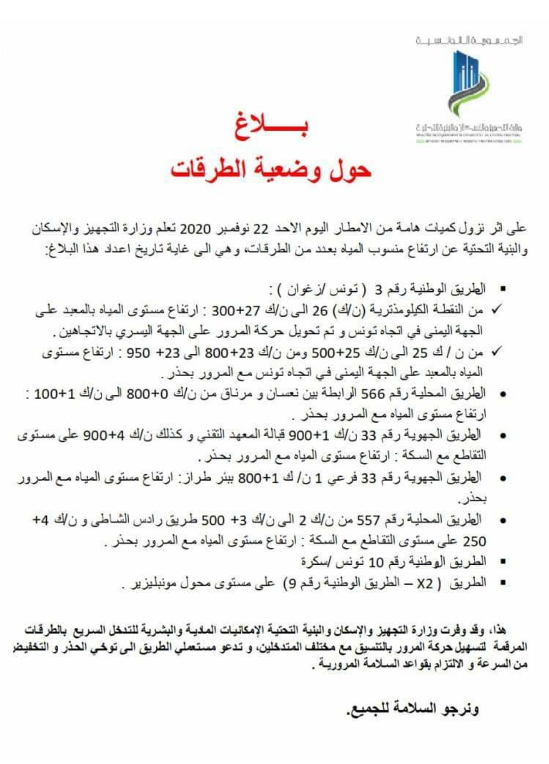 المنبر التونسي (طرقات أمطار) – أعلنت وزارة التجهيز والاسكان والبنية التحتية مساء اليوم ،الأحد 22 نوفمبر 2020، عن ارتفاع منسوب المياه بعدد من الطرقات.