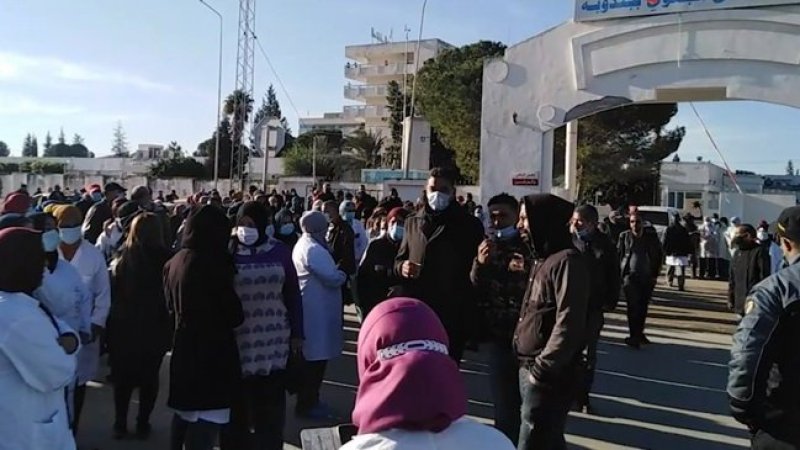 المنبر التونسي (جندوبة)-في توديع لزميلهم الطبيب الشاب بدر الدين العلوي الذي توفي لبلة البارحة الخميس 3 ديسمبر 2020 بعد سقوطه من مصعد كهربائي بالمستشفى الجهوي بجندوبة، ودّع الإطار الطبي وشبه الطبي والعمال في مستشفى جندوبة، زميلهم بالدموع والزغاريد.