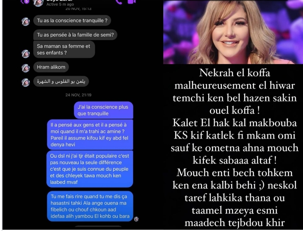 المنبر التونسي (بية الزردي)-تهجمت مريم الدباغ الاعلامية بية الزردي و نشرت محادثة خاصة بينهما حول سامي الفهري.