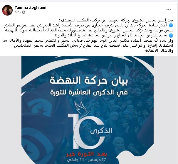 المنبر التونسي (حركة النهضة)-نشرت عضو مجلس نواب الشعب عن كتلة حركة النهضة يمينة الزغلامي اليوم السبت 2 جانفي 2021، تدوينة عبر حسابها الرسمي على موقع التواصل الاجتماعي الفايسبوك أعلنت فيها مغادرتها لقيادة الحركة بعد أن كانت ضمن المكتب التنفيذي السابق الذي اختاره رئيس الحركة راشد الغنوشي بعد المؤتمر العاشر.