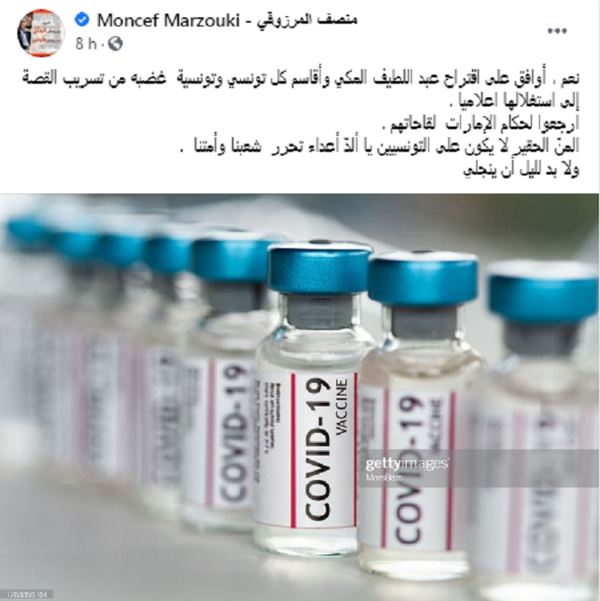المنبر التونسي (منصف المرزوقي) – نشر رئيس الجمهورية الأسبق المنصف المرزوقي تدوينة عبر صفحته الرسمية على موقع التواصل الاجتماعي فايس بوك مساء أمس الخميس 4 مارس 2021، عبّر من خلالها عن مساندته لموقف وزير الصحة السابق والقيادي في حركة النهضة عبد اللطيف المكي الذي طالب رئيس الحكومة هشام المشيشي بإعادة كمية اللقاحات التي قدّمتها دولة الإمارات إلى رئاسة الجمهورية كهبة”.