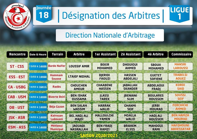 المنبر التونسي (تعيينات حكام الجولة 18) – نشرت الجامعة التونسية لكرة القدم على صفحتها الرسميةعلى الفايسبوك تعييناك حكام الجولة 18 من الرابطة المحترفة الأولى: