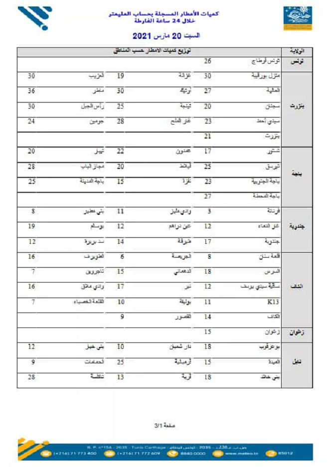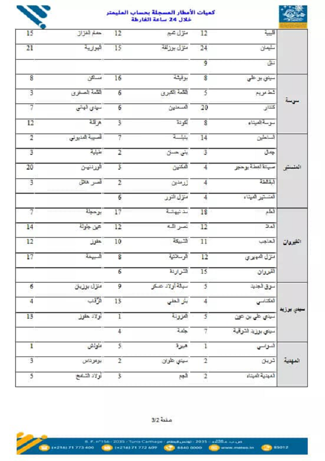 المنبر التونسي (كميات الأمطار المسجلة) – سجل خلال 24 ساعة الاخيرة نزول كميات من الامطار في عدد من مناطق البلاد كان اهمها 36 مم بماطر و30 مم بكل من اوتيك وراس الجبل وفي ما يلي الكميات المسجلة بالتفصيل وبحساب المليمتر: