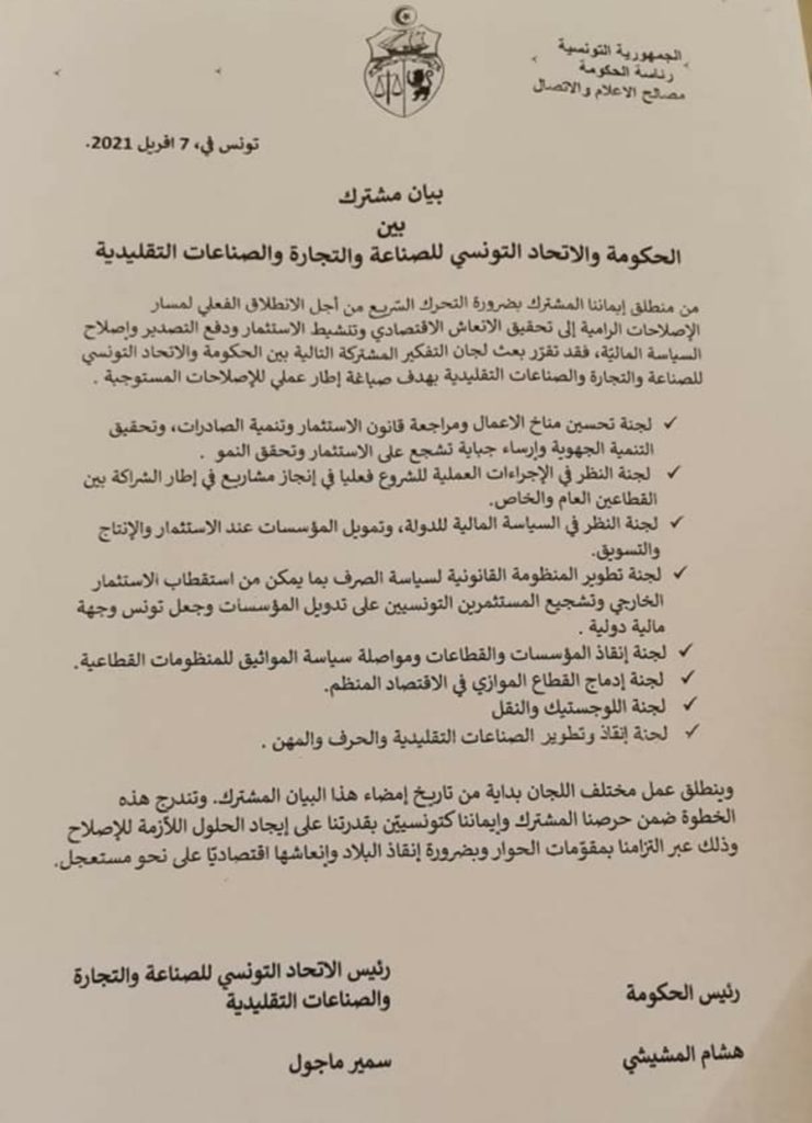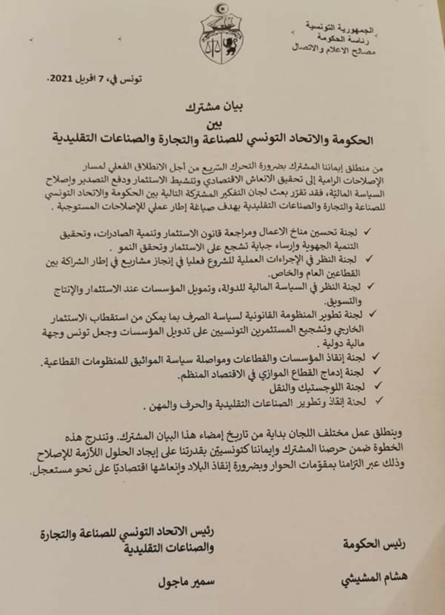 المنبر التونسي (اتحاد الصناعة والتجارة والحكومة) – تم مساء اليوم الأربعاء 7 أفريل 2021 إمضاء بيان مشترك بين رئاسة الحكومة والإتحاد التونسي للصناعة والتجارة والصناعات التقليدية من أجل الإصلاح الاقتصادي وتنشيط الإستثمار .