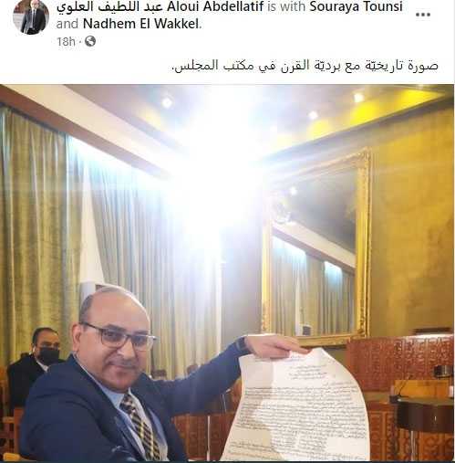 واعتبروا ان الرسائل والمراسلات بين قيادات الدولة من الوثائق المهمة تحفظ الا ان رسالة قيس سعيد الرئيس للغنوشي يتناقلها النواب على غرار عبد اللطيف العلوي النائب عن ائتلاف الكرامة ليلتقط معها “سلفي” بطريقة ساخرة.