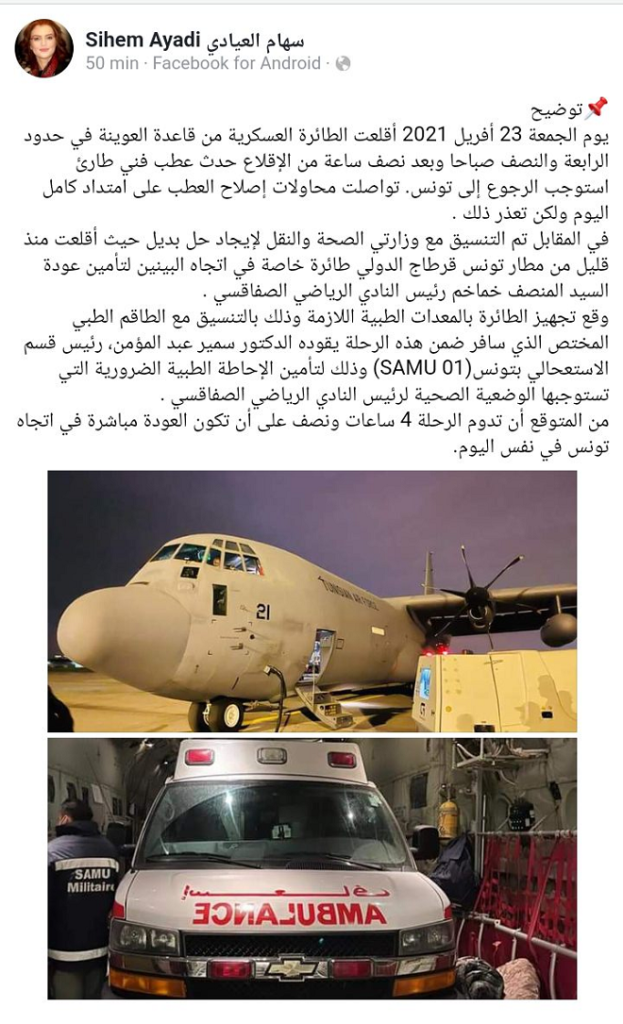 يوم الجمعة 23 أفريل 2021 أقلعت الطائرة العسكرية من قاعدة العوينة في حدود الرابعة والنصف صباحا وبعد نصف ساعة من الإقلاع حدث عطب فني طارئ استوجب الرجوع إلى تونس. تواصلت محاولات إصلاح العطب على امتداد كامل اليوم ولكن تعذر ذلك .