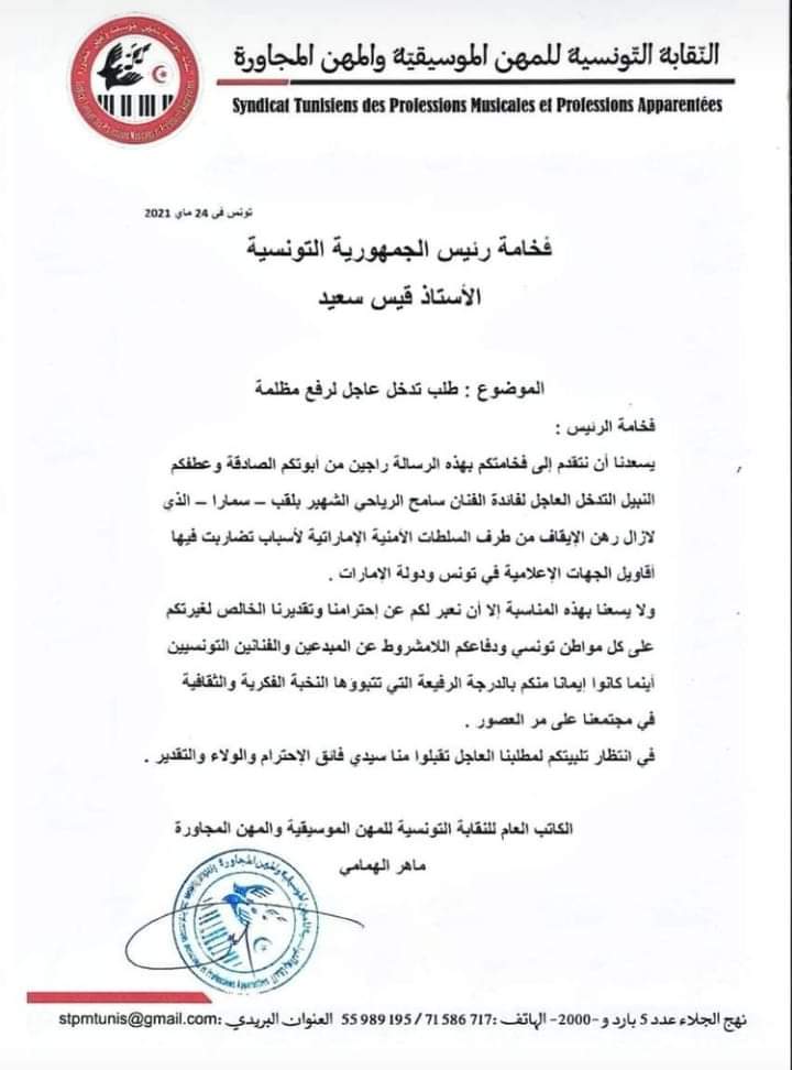 المنبر التونسي (سامارا) – طلبت النقابة التونسية للمهن الموسيقية والمهن المجاورة من رئيس الجمهورية التدخل لفائدة مغني الراب سامارا.
