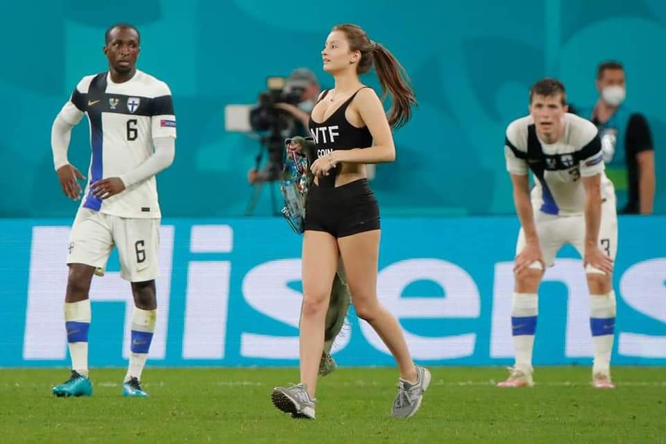 قميص الفتاة كان مكتوبا عليه اسم موقِع لعملة رقمية مشفرة منافسة للعملة الرقمية الشهيرة بيتكوين مستغلة نهائيات يورو 2020 والمقامة في 11 مدينة تنتمي لـ11 دولة للقيام بإشهار منتجاتها عبر اقتحام الملعب وإثارة الانتباه الإعلامي والجماهيري والمواقع الاجتماعية العالمية